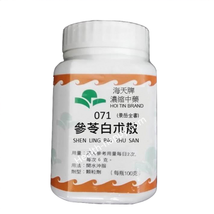 茯苓(15克)﹑山藥(15克)﹑白朮(15克)﹑白扁豆(12克)﹑蓮子肉(9克)﹑薏苡仁(9克)﹑黨參(9克)﹑砂仁(6克)﹑生甘草(6克)﹑大棗(6克)﹑桔梗(6克)﹑陳皮(6克)